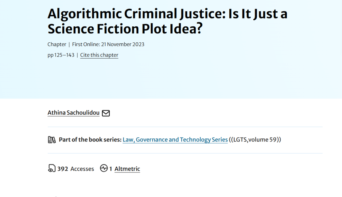 Sachoulidou, Athina. Algorithmic Criminal Justice: Is It Just a Science Fiction Plot Idea? Law, Governance and Technology Series , 2023 [CS 0.3, 21st, 695/885 Law] [CS 2023 0.3], 59, pp. 125–143.