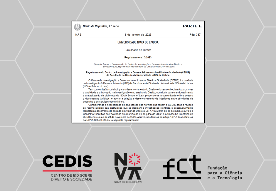 O Centro de Investigação e Desenvolvimento sobre Direito e Sociedade (CEDIS) da NOVA School of Law iniciou o ano com novo regulamento. O documento n.º 3/2023 foi publicado no Diário da República n.º 02/2023, Série II de 03 de janeiro de 2023.