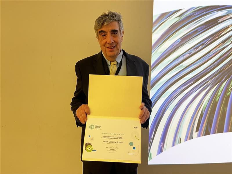 Um dos momentos de maior destaque do evento foi a menção honrosa recebida na sessão NOVA Research Impact Narratives & Awards. O Distinguished Research Professor Jeremy Sarkin foi reconhecido pelo seu projeto de investigação intitulado Conducting Constitutional Reform in a United Kingdom Overseas Territory. O projeto, que se foca na reforma constitucional de territórios ultramarinos do Reino Unido, tem sido uma contribuição significativa para o campo do direito constitucional e das reformas políticas, demonstrando o impacto da sua investigação na formulação de políticas públicas e na justiça global.